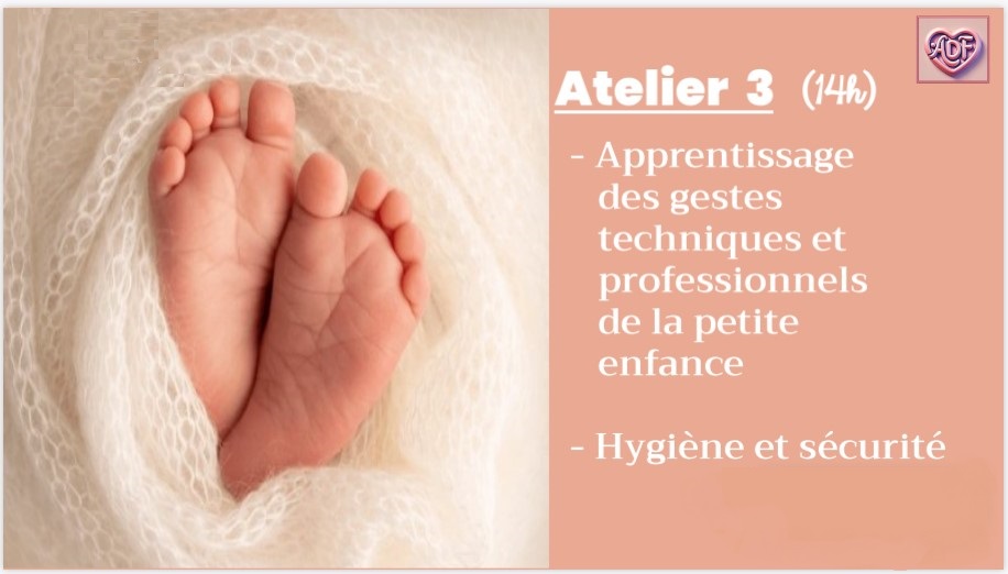 Apprentissage des besoins      fondamentaux de l’enfant et gestes techniques et professionnels de la petite enfance, règles d’hygiène et de sécurité.